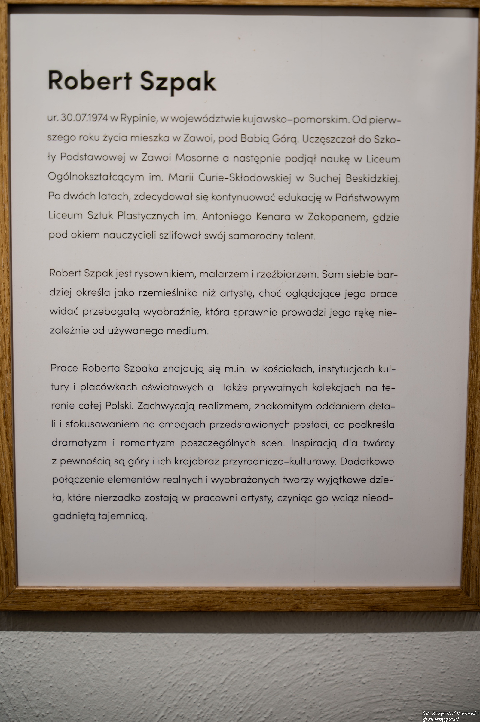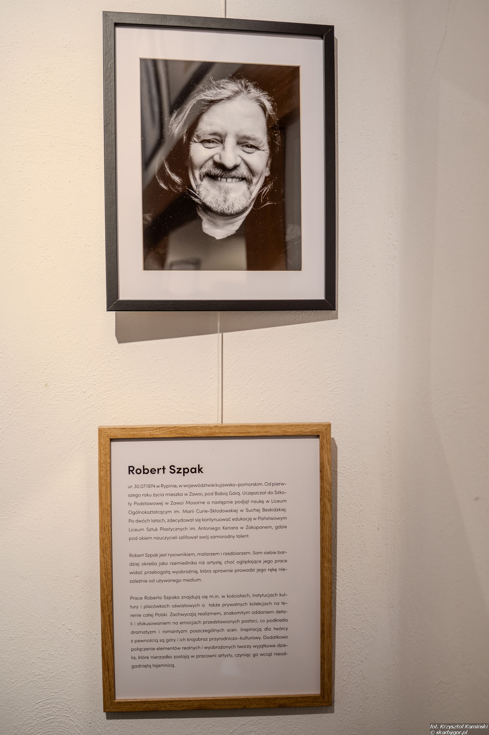 Robert Szpak jest rysownikiem, malarzem i rzeźbiarzem. Sam siebie określa jako rzemieślnika z duszą artysty – w jego pracach techniczna precyzja łączy się z bogatą wyobraźnią. Jego rysunki zachwycają realizmem, doskonałym oddaniem detali i emocji, często utrzymane są w czerni i bieli, z wyraźnym ładunkiem dramatyzmu i romantyzmu. Inspirację czerpie z krajobrazu Babiej Góry i tradycji kulturowej regionu.