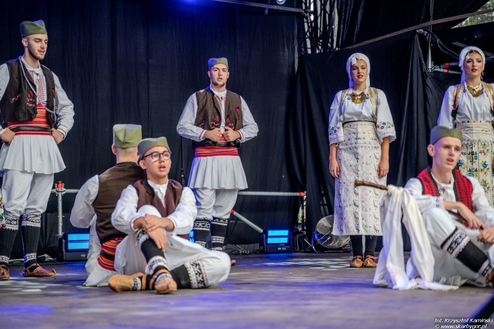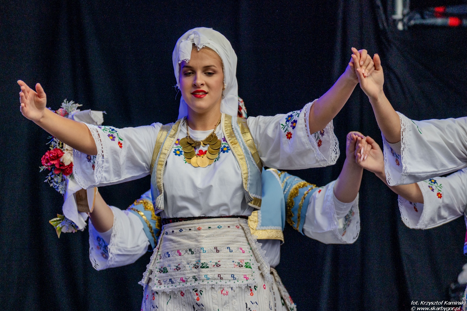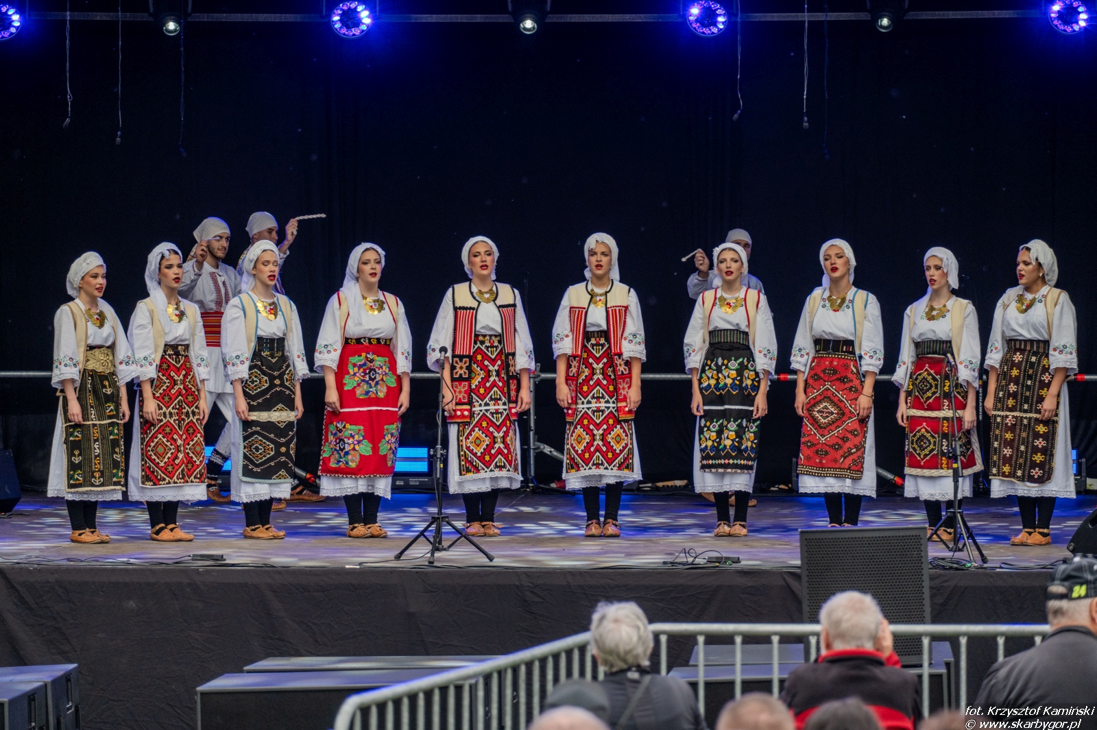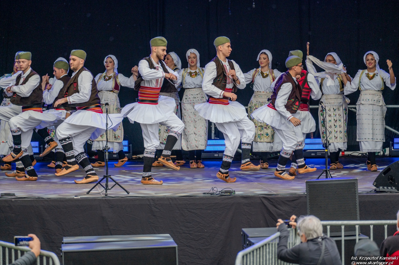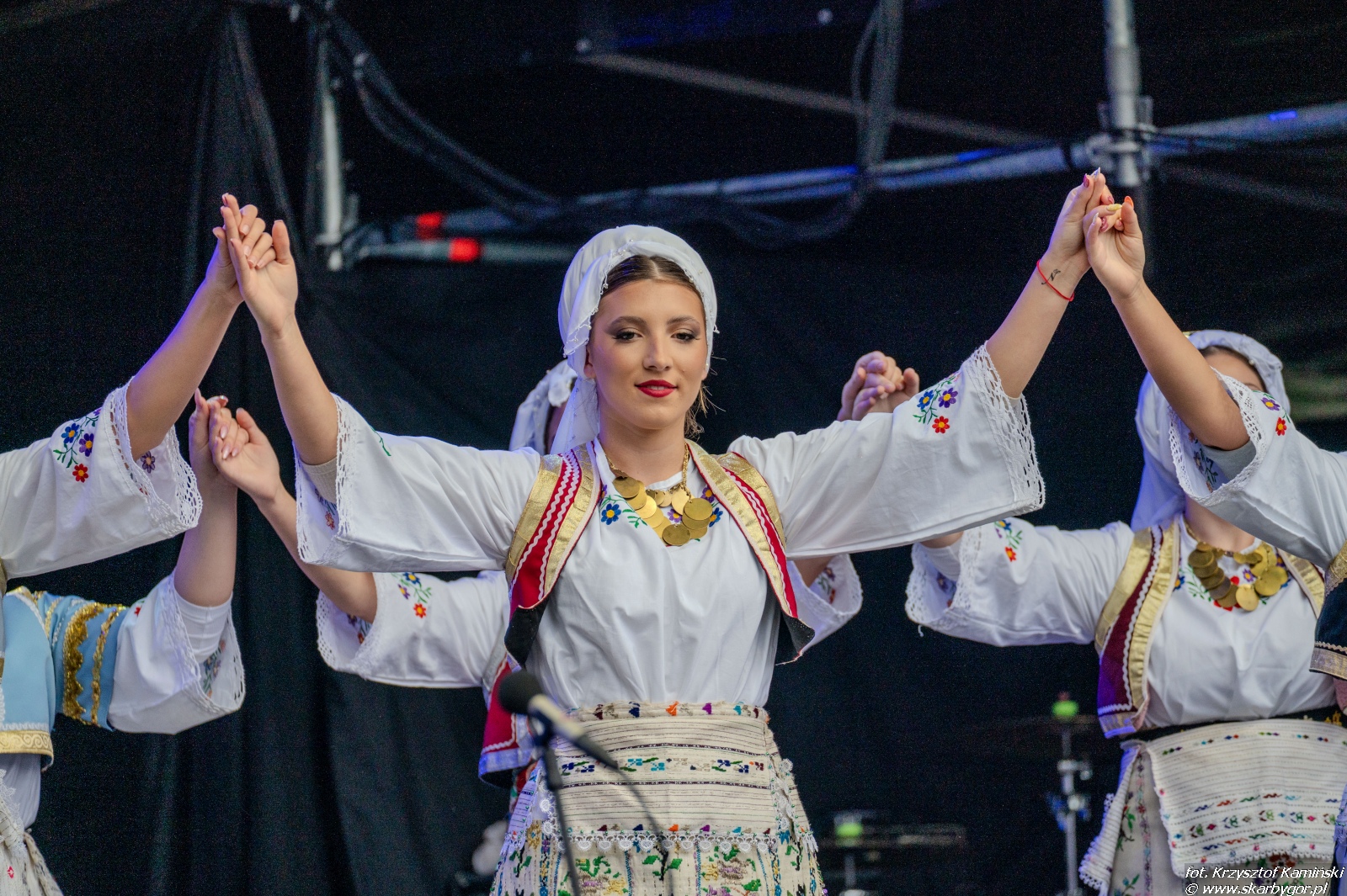 Kostiumy, pełne intensywnych kolorów i ozdobnych detali, pięknie uzupełniały prezentowaną muzykę i ruch, tworząc spójną, efektowną całość. Występ zespołu Sloboda Rumenka wniósł na scenę zupełnie inną, bałkańską energię, ukazując bogactwo kultur uczestniczących w festiwalu.